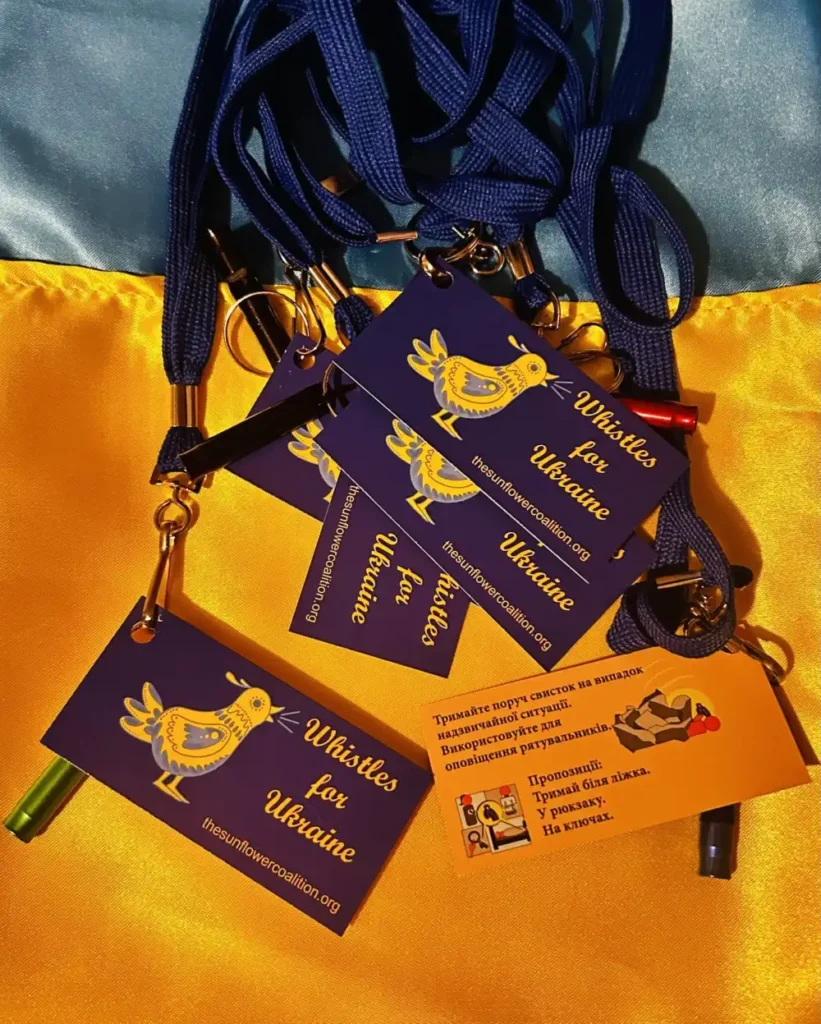 With your help of purchasing whistles or donating directly, we will distribute whistles in towns across Ukraine to ensure that as many people as possible have the ability to call out for help no matter what the circumstances are.